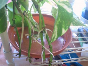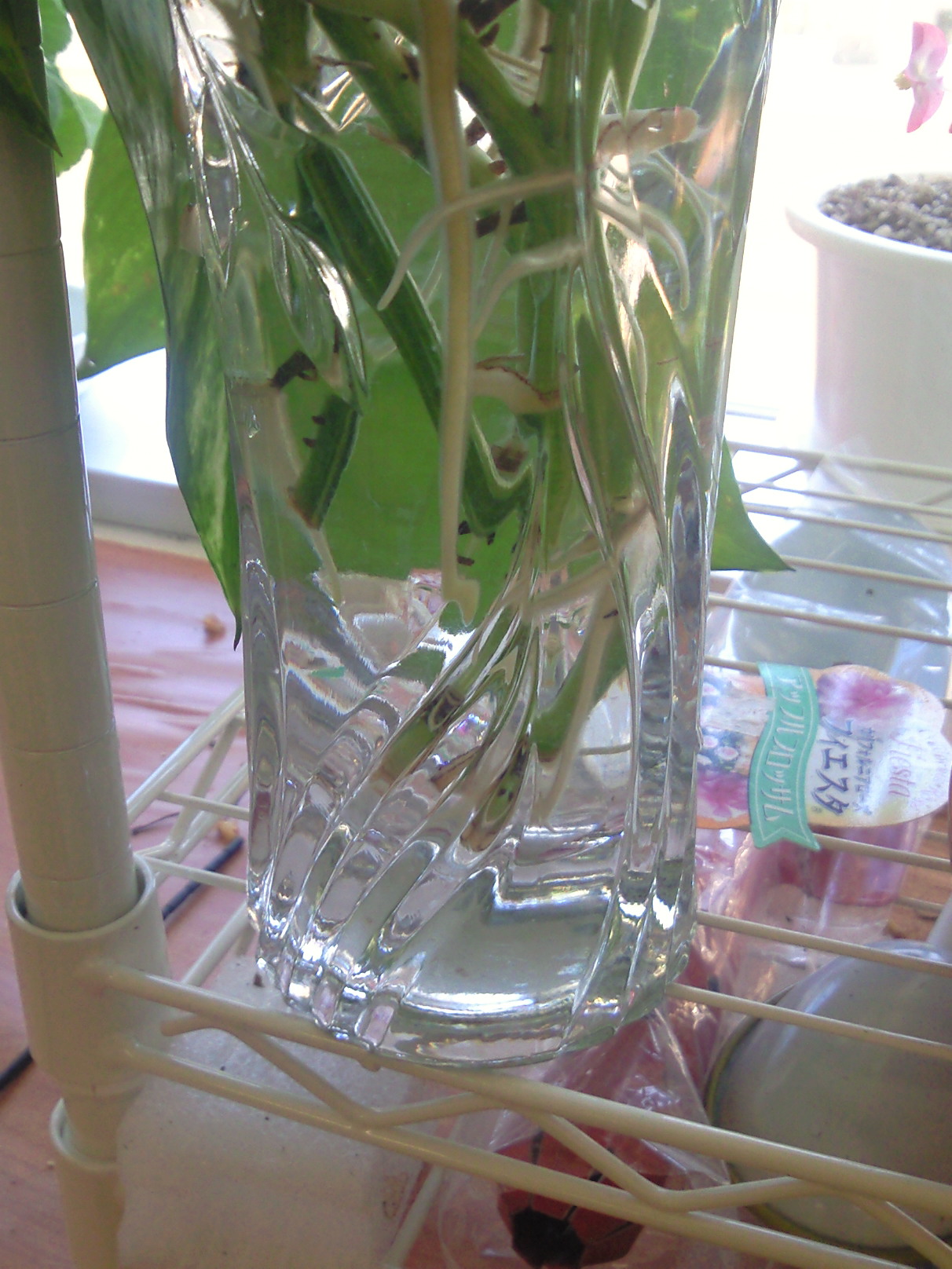 植え替えのため水にさしていたポトスの根が生えてきた。