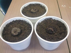 昨年の分はもう死んでいると思うほど縮んで、干しがきのようであった。でも・・・ちゃんと芽が出てきた。