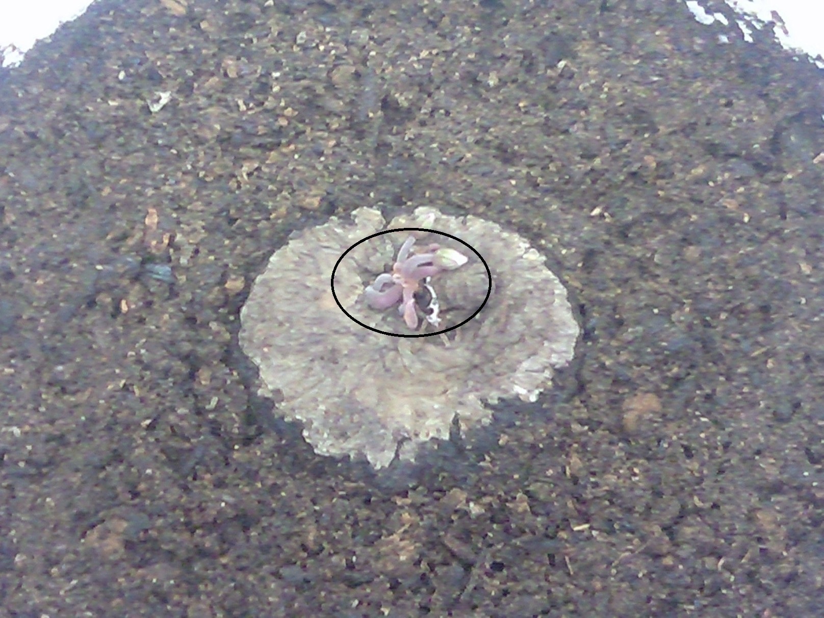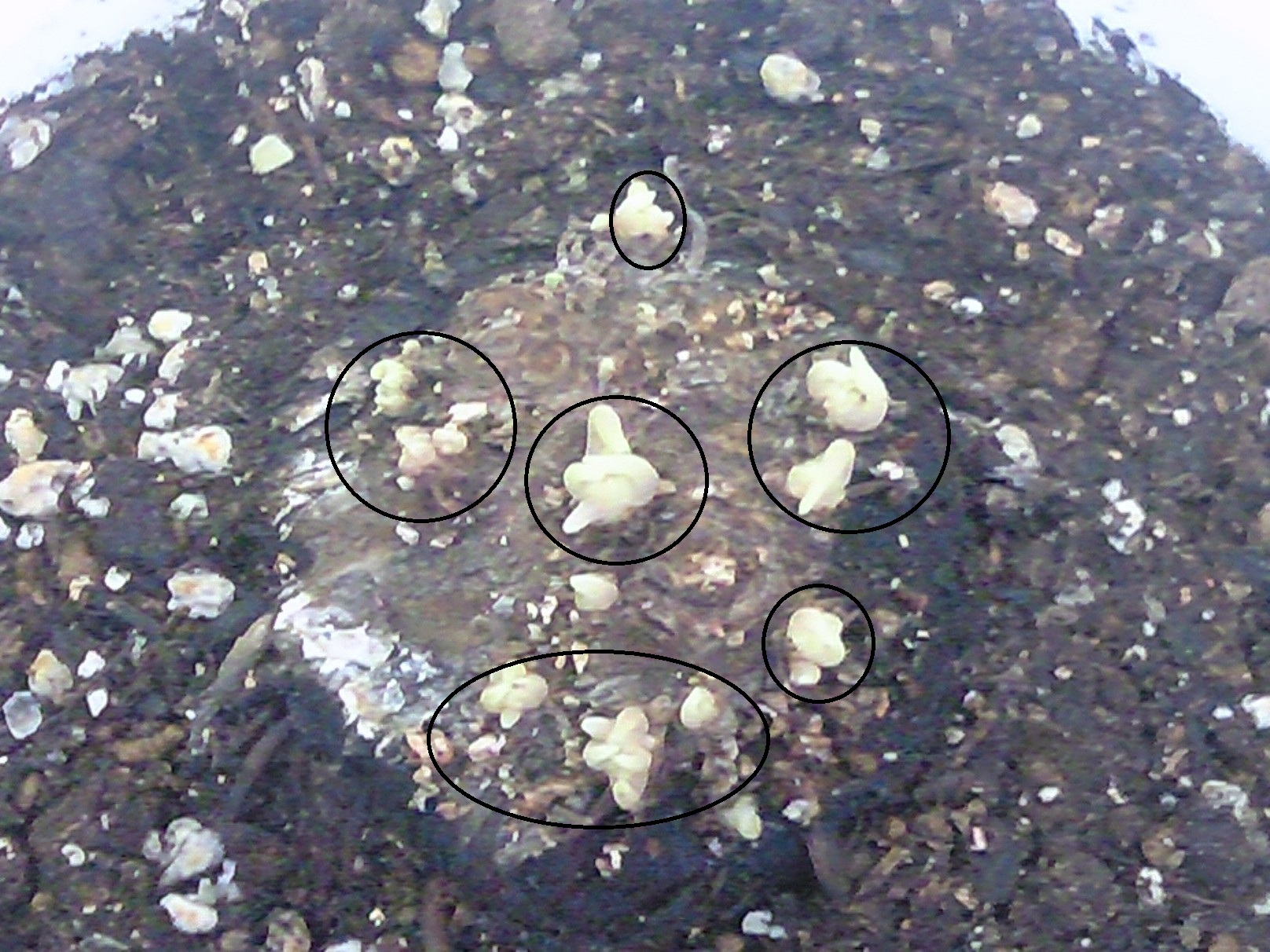 先週植えたシクラメンの株から芽が出てきた。植えてから4,5日目である・・・・
