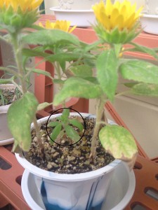 写真中央に同じ種から育った小夏、他の4本の間で日がほとんど当たらず、ミニミニひまわりの状態で小さな蕾をつけている。・・・・・・かわいい・・・