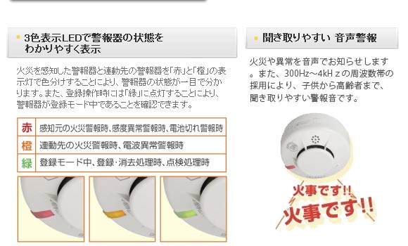 これは値段は高いが優れものである。火災が発生するとその部屋だけでなく無線で設置している部屋すべてに報知される。