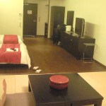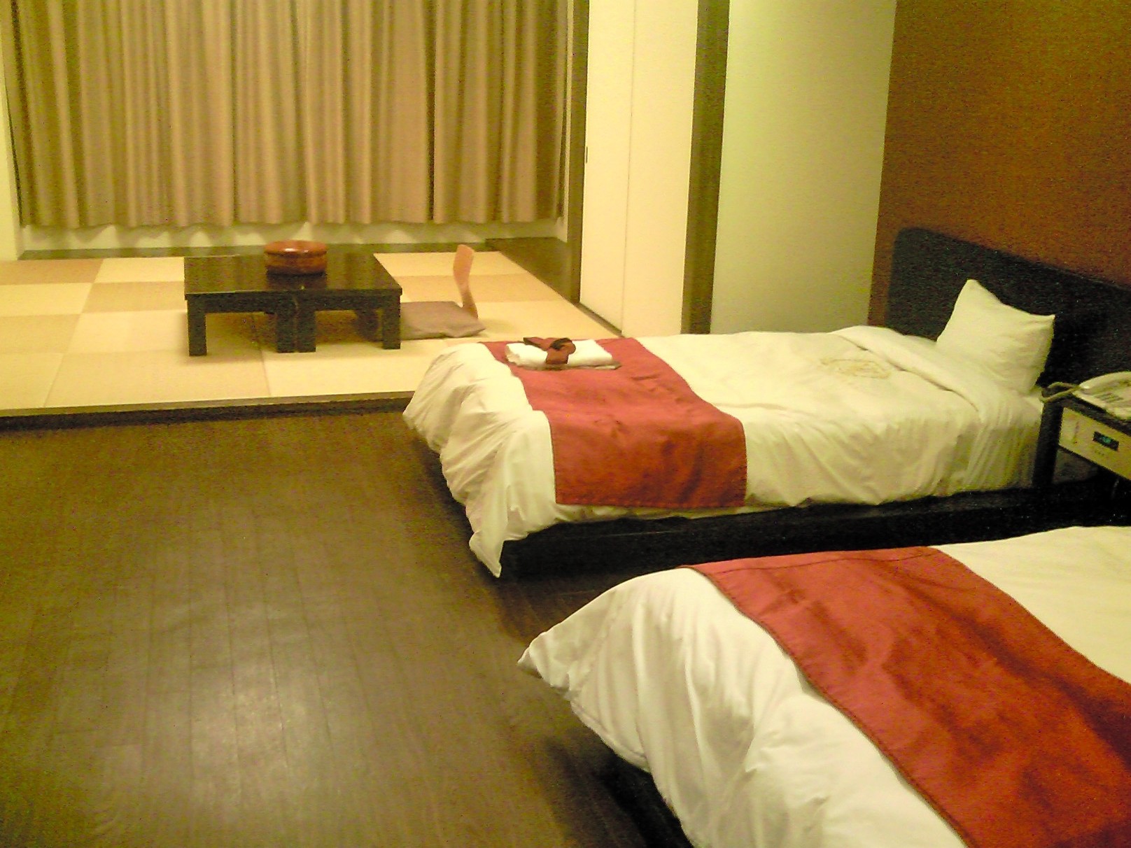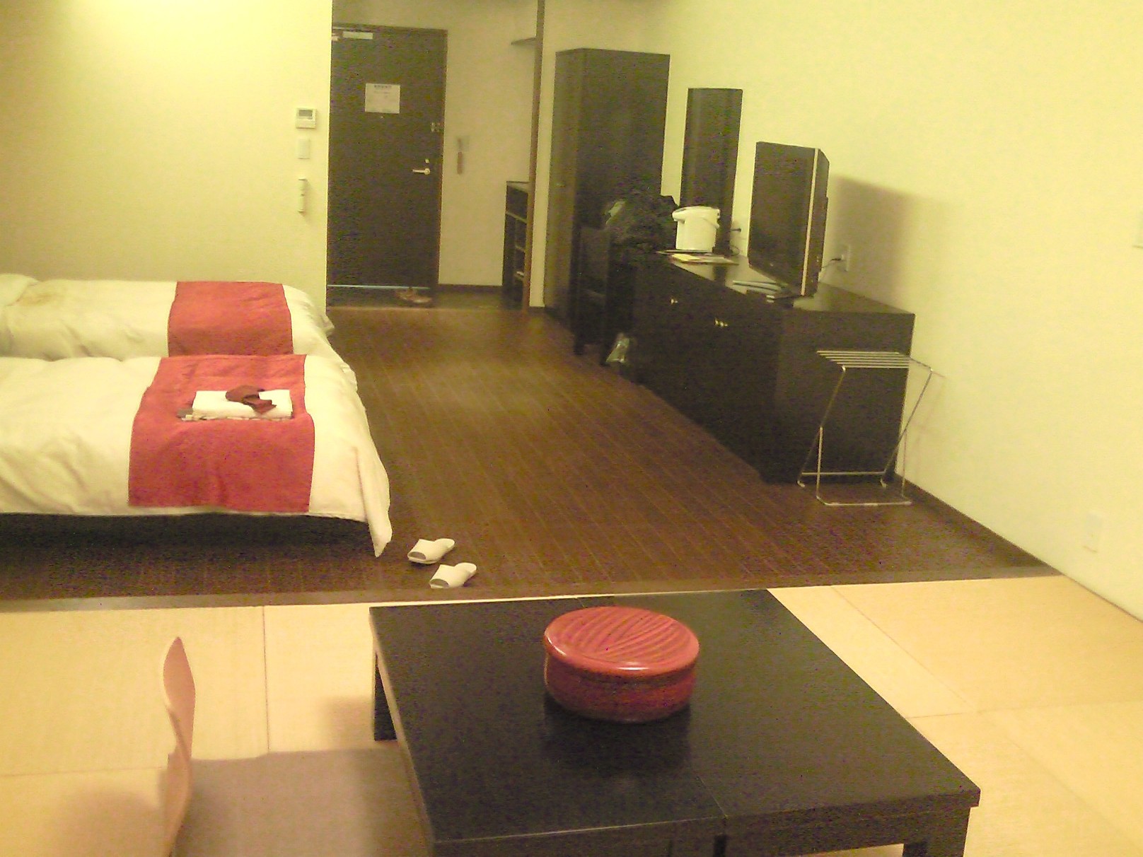 外に出ると、大変寒い、暗い・・・・・はや歩きで・・・・でも時間はどんどん過ぎていく。途中軽く走ったりしたが、何よりも酔っ払い・・・・地獄のような時間を感じた。ホテルへついたのは夜の12時5分、事前に電話を入れていたので、玄関はあいていた。息を上げながら部屋までたどり着いた。シングルの予約であったが結構広い部屋、多分4人から5人部屋であろう!