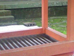 お賽銭を上げたら珍しいことに、一度、箱の金属の格子ではじいて縁の棒の上にぴったりとどまった。写真中央ブロックの下ぐらいに100円だまが・・・・・。