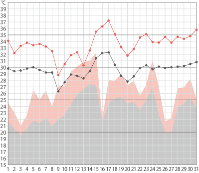 線の赤が2010年、黒が1980年、それぞれ、平均気温は同じ色のべた塗り