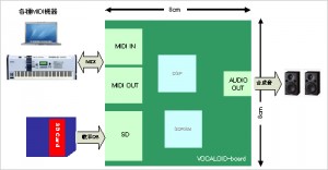 VOCALOID-boardは、従来のボーカロイドとほぼ同等な機能をひとつのボードに実装し、ロボット、カラオケ機器、電子楽器など単体機器に組み込むことを可能にしたものです。