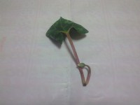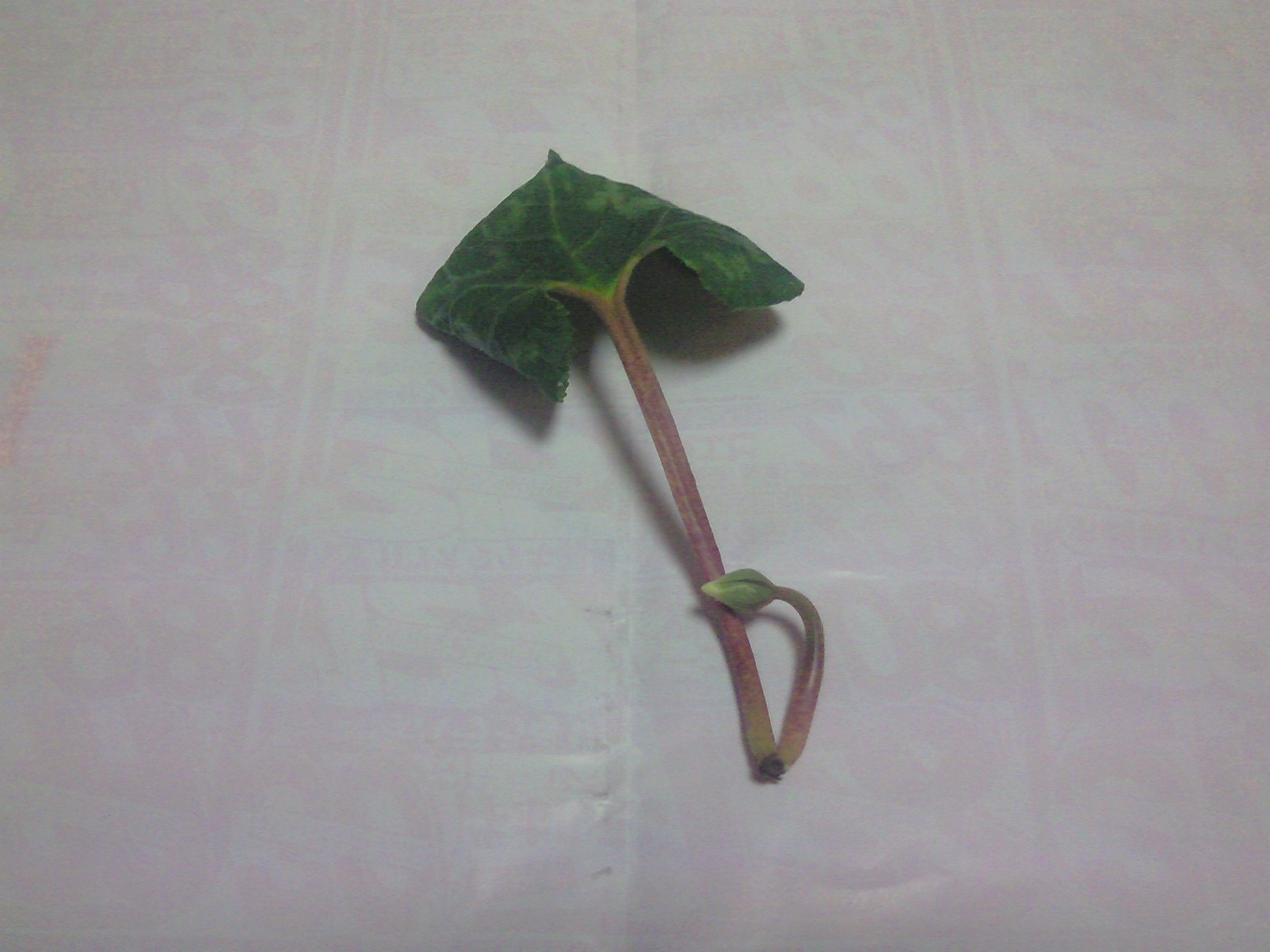 自宅においている方のシクラメンで葉が痛んできたのがあったのでもぎとると根元に蕾が・・・・