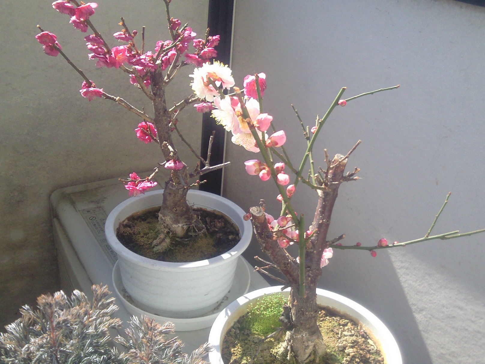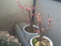 梅が早い開花・・・・今年はおき場所がなく、ベランダで寂しく咲いている。しかも、剪定にミスしてつぼみが少なく、花も少ない。