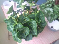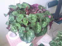 次が黄色シクラメン、こちらは小ぶりで、葉があちこちに茂って、葉組さえ難しい。しかし、茎がしっかりとしていて、いい花が咲きそうな予感。