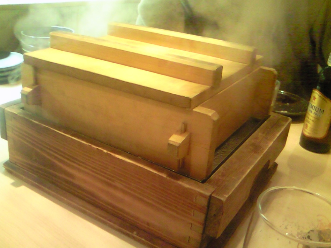 さらに珍しい料理が蒸し器なるものが出て目の前でお湯を注ぎ湯気がいっぱいに
