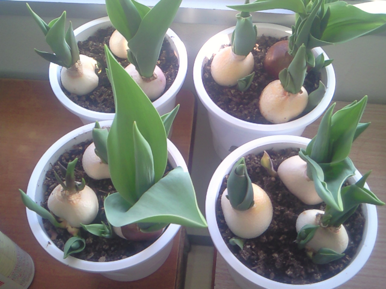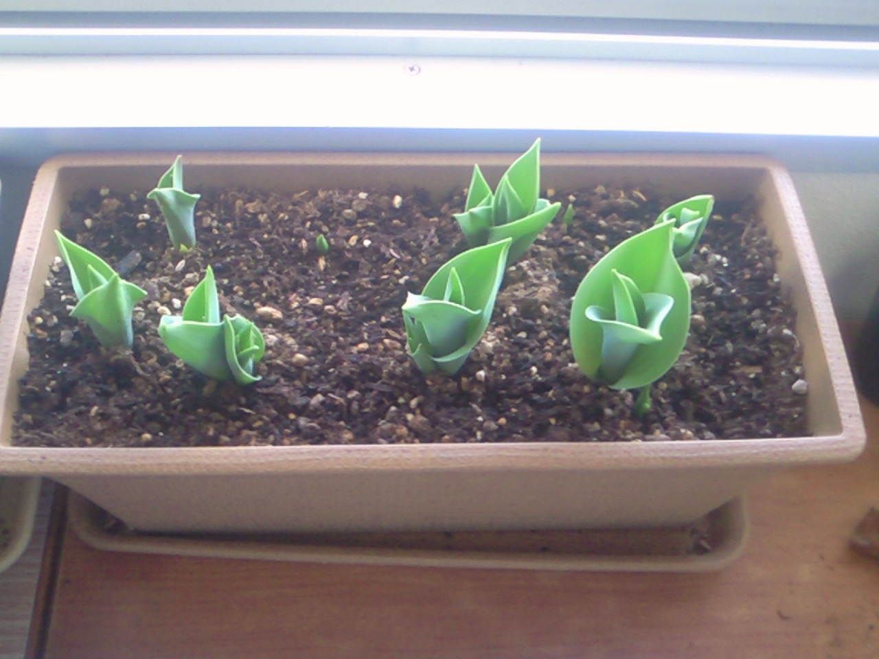 めんどくさいので、底面給水は2鉢の各3球ずつ、長方形の鉢に土飢えで20球近く植えつけた。