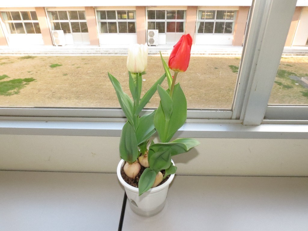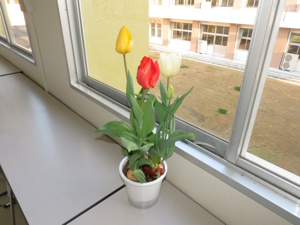 最初に植えた底面給水型のチューリップが開花し職員室前の廊下へ設置