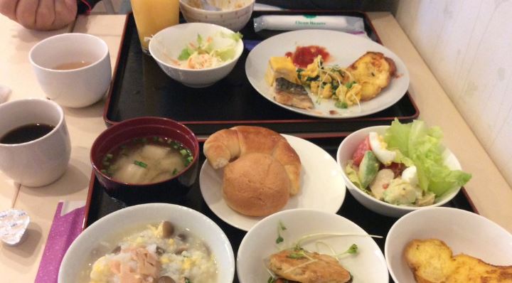 実際のお盆に取った料理はこちら・・・まず、ホテルWebサイトであった写真で洋食風はこちらでもおかず少なめ。。