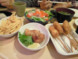 結局、唐揚げ、串カツ5本セット、ビール、フライドポテト、貝汁他