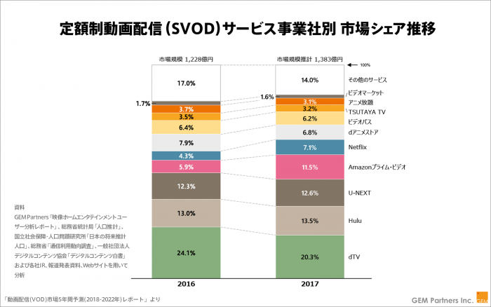 それによれば「dTV」のシェアが最も大きく、シェア2位は「Hulu」、3位は「U-NEXT」と続いている、上位3社が定額制動画配信サービス全体に占めるシェアは46.4%。一方で、2017年は4位の「Amazonプライム・ビデオ」や5位の「Netflix」の成長率が他サービスと比較して大きくなっている。