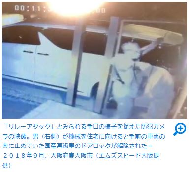 車のキーを近づけるだけで、電波でドアのロックを解除しエンジンを始動できる「スマートキー」の機能を悪用した疑いのある盗難未遂事件が、大阪府内で確認された。離れたキーと車の電波を特殊な機械で中継して解錠する「リレーアタック」と呼ばれる新たな手口で、今後国内で被害が広がる恐れがある。 昨年9月下旬、大阪府東大阪市の住宅。白いマスク姿の男が玄関に近づき、アンテナの付いた機械を住宅に向けると、敷地に止めていた国産高級車のハザードランプが点滅、わずか5秒ほどでドアロックが解除された。防犯カメラが一部始終を捉えていた。