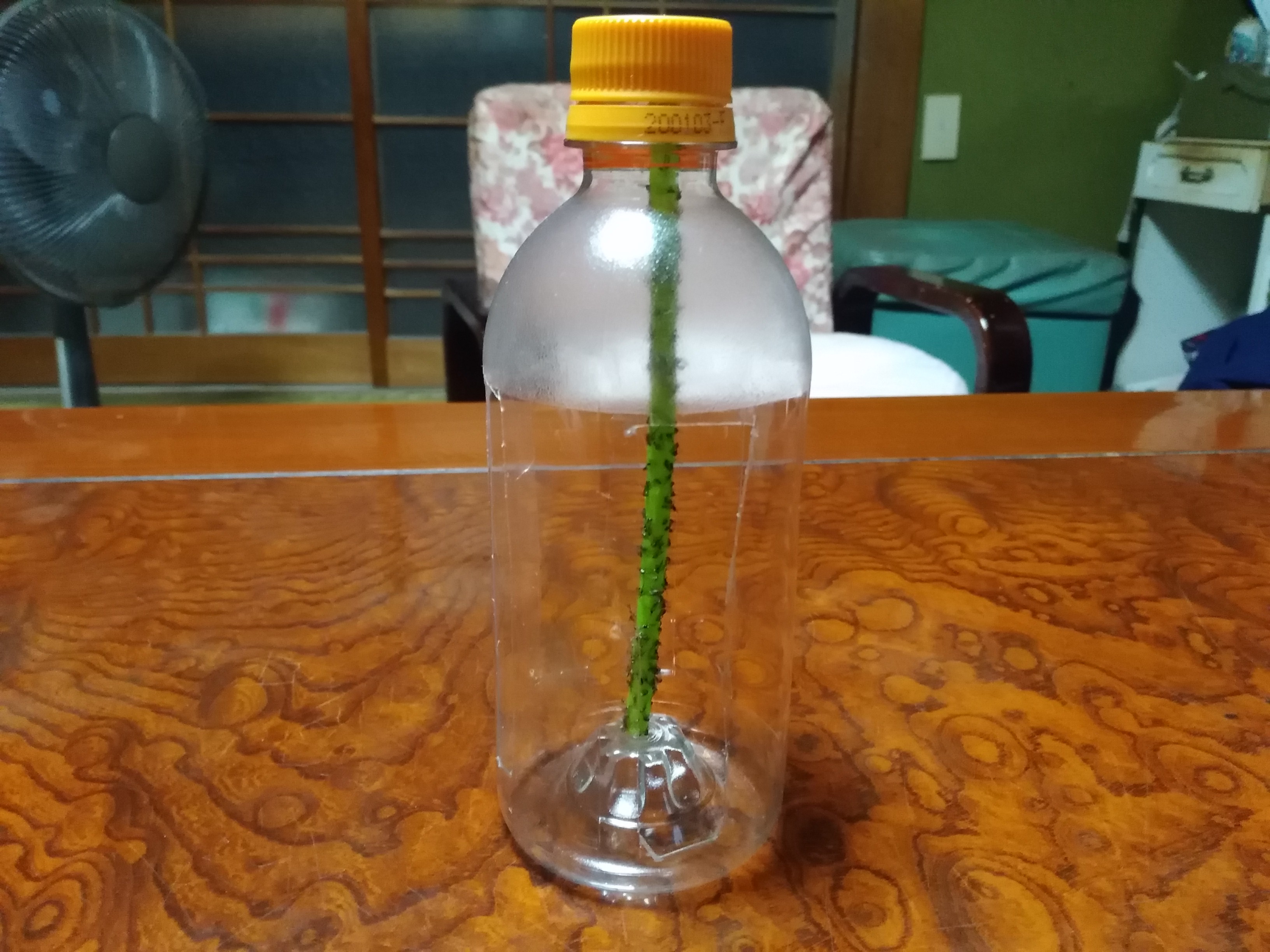 写真のハエ取り棒を次の写真の大好きな「綾鷹ペットボトル」を改造して、その中にセットしてみた。