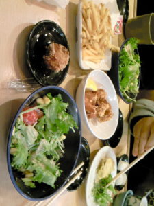 いつもと同じなのは、ビール、野菜サラダ、空揚げ、ポテトスティック、焼酎お湯割り