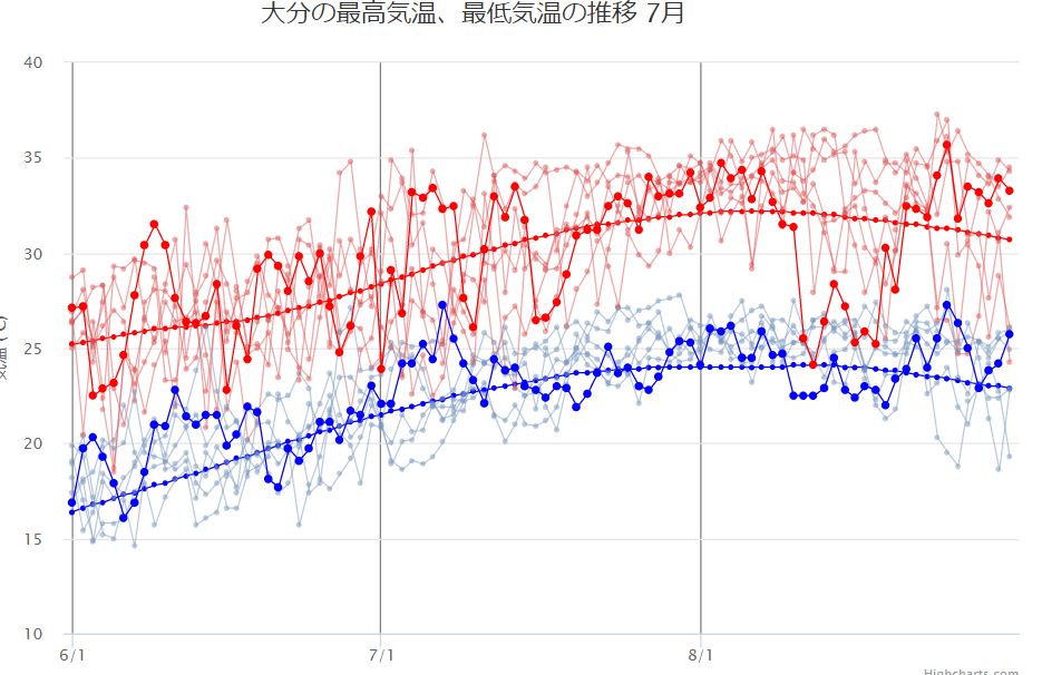 最低気温は23度台、日本の昔の夏は朝晩が涼しかった印象がある。やはり記録は残っていた。