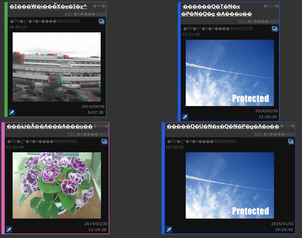 写真データベースのアルバムファクトリーというCGIを設置しているが、数年前から文字化けして,すべて宇宙語になっていた。それが、今回の機会で、サーバの設定も「Shift_JIS」に変更するとまた、ちゃんと表示されるようになった。文字化けし続けた状態はこちら