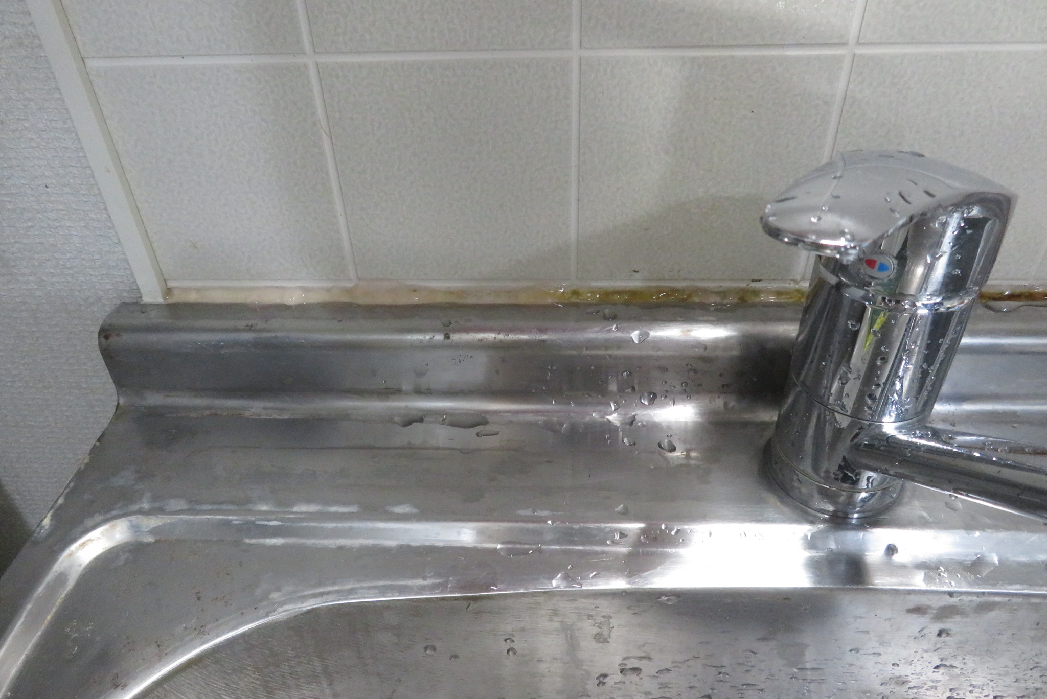 中央タイルとステンレスの境目にカビが付着して根を貼っている。