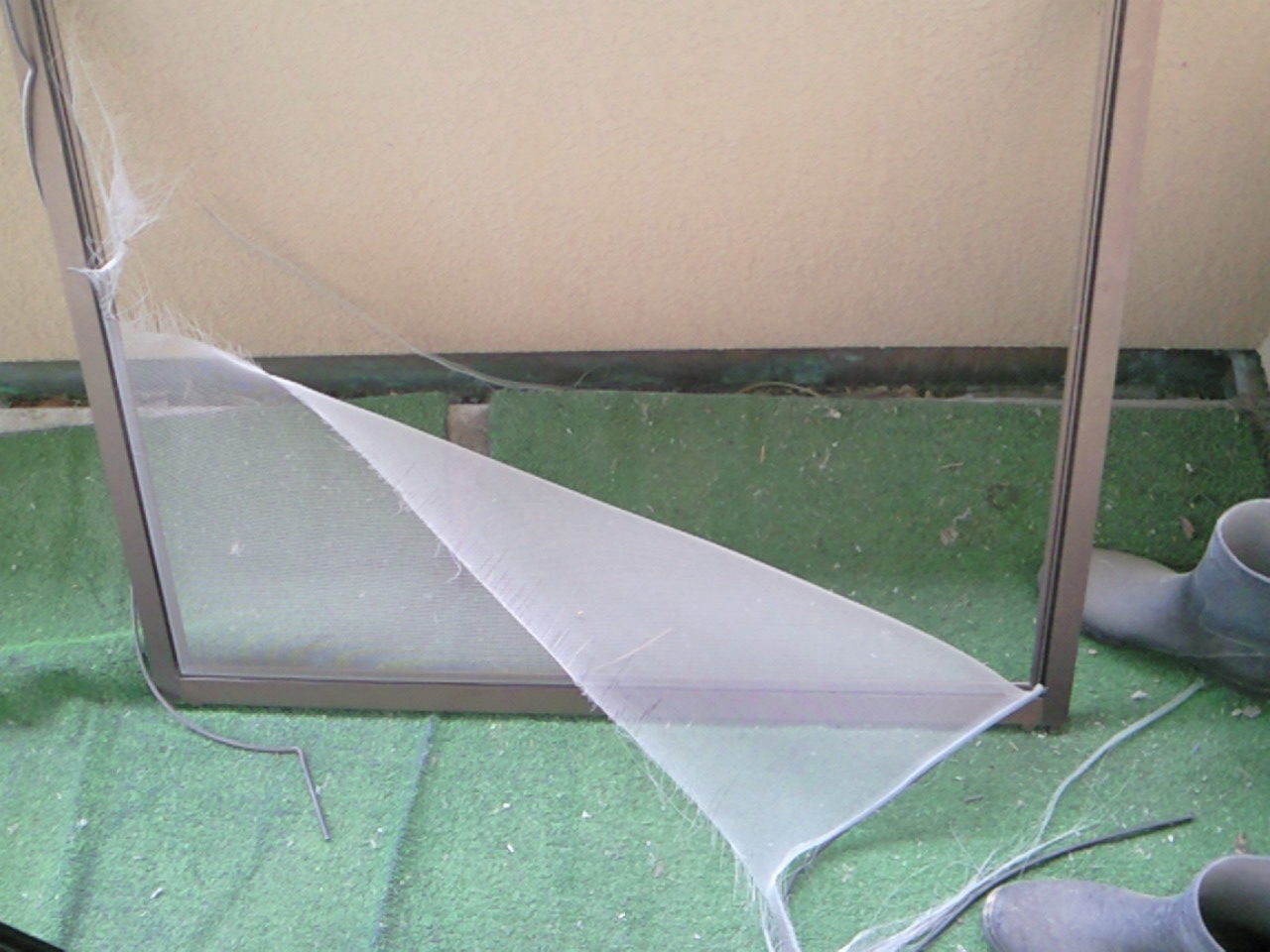 写真はベランダで作業しかけている実際に破れた網戸。張り替えで網を取り外しかけているが、半分ほど網がやぶれている。ここ2~3年ここだけを応急処置で、上からガムテープなどで貼っていた。