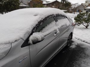 駐車上の愛車も積雪・・・でもこれは昨日国東町内ですでに積雪していたその上から昨夜から今朝にかけて降り積もった雪である。