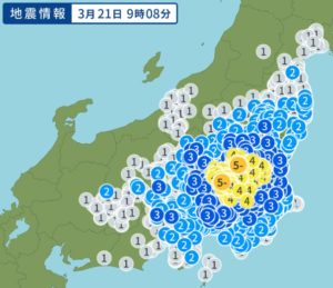 3月21日(木)茨城県南部で、マグネチュード5.3、最大震度5弱の地震が起こった。