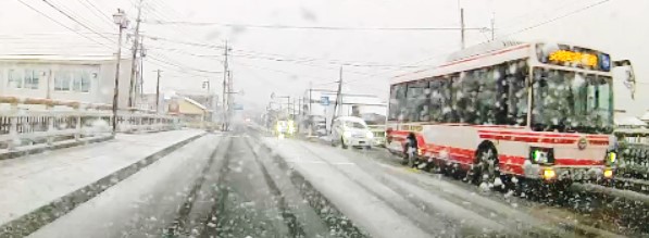 令和6年度 令和7年1月10日(金)冬型強まり降雪 大分県の国東半島周辺は地域によって積雪状態が違うが今回は、国東から宇佐まで道路も全区間積雪・凍結した。映像で黒い部分は地面ではなくブラックアイスバーンで、路面は全区間つるつる。朝の6時前に自宅を出たが、フロントガラスが積雪と凍結でそれをとかすのに15分程度かかった。幸いにも前日夕方、布チェーンは装着していたので、それを装着する時間は不要であった。
