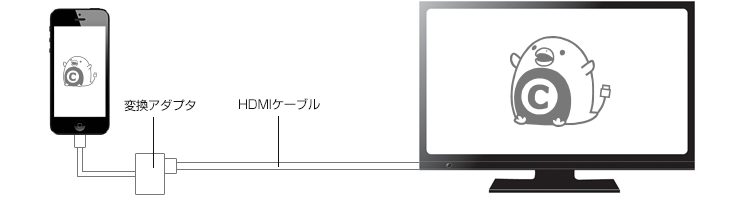 こちらはiPhoneの画面をテレビに出力する方法の1つ、テレビと直接HDMIケーブルを繋げるが、iPhoneにはHDMI出力端子が無い為、30ピン(Dockコネクタ)/Lightningコネクタに変換するアダプタを使用。iPhone4/4Sは30ピン(Dockコネクタ)を、iPhone5以降の機種はLightningコネクタ搭載のアダプタを利用。