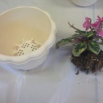 土を落としていき、さらに、不要な根を切断。写真は、根を小さくカットしたセントポーリアと新しい鉢である。